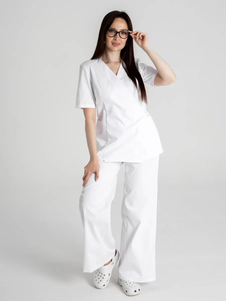 Костюм (хирургичка) приталенного кроя с 2-мя нижними накладными карманами, по бокам разрезы. V - образный вырез. Петелька для крепления бейджика. Брюки прямые с поясом на эластичной резинке, швы отстрочены двойной строчкой. На одной из штанин два накладных кармана, один на другом с закрепками контрастного цвета.
