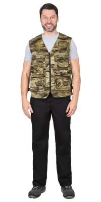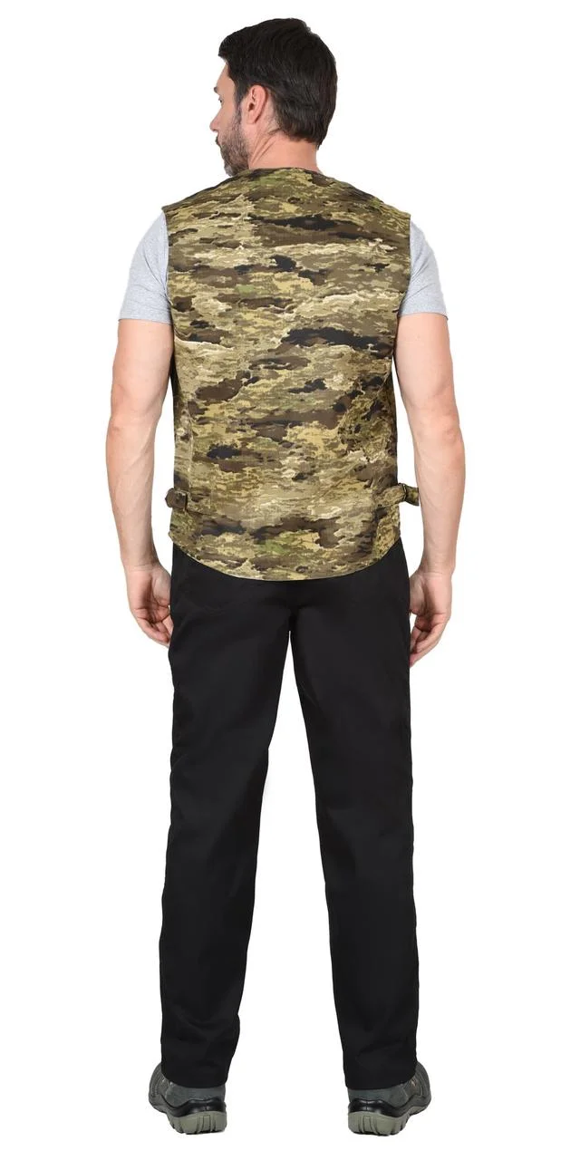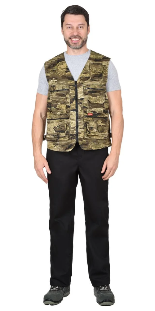 Жилет с V-образным вырезом горловины; с центральной застёжкой на тесьму - «молнию»; с различными многофункциональными карманами с объёмами и с клапанами на липучках; хлястиками и держателями с полукольцами; фигурным низом.