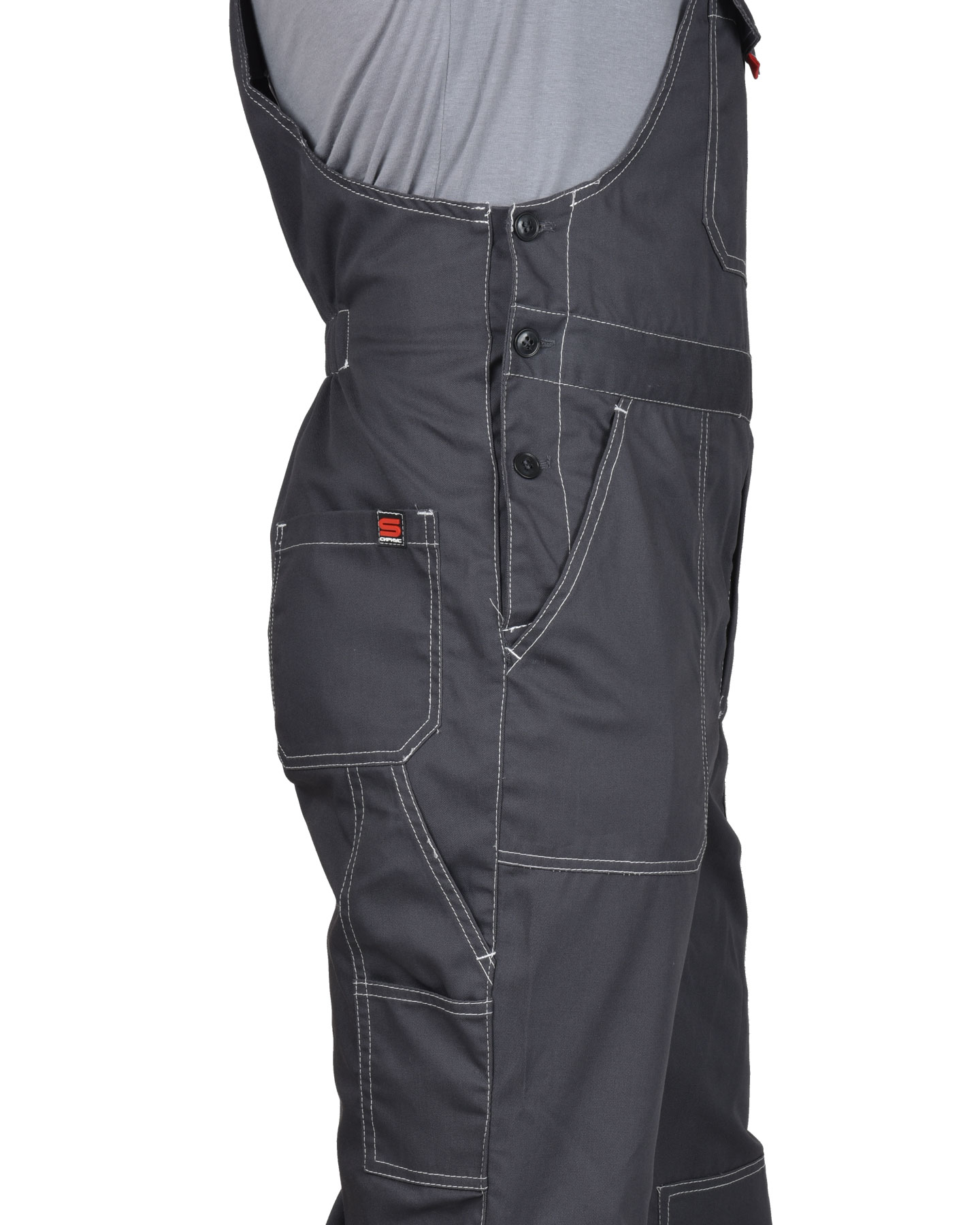 Полукомбинезон оснащен застежкой спереди на молнию и дополнительной застежкой в правом боковом шве на пуговицы. Он имеет многофункциональные карманы и объемные наколенники для дополнительного удобства. Бретели регулируются за счет эластичной ленты и фастексов, а эластичная лента по спинке улучшает прилегание.