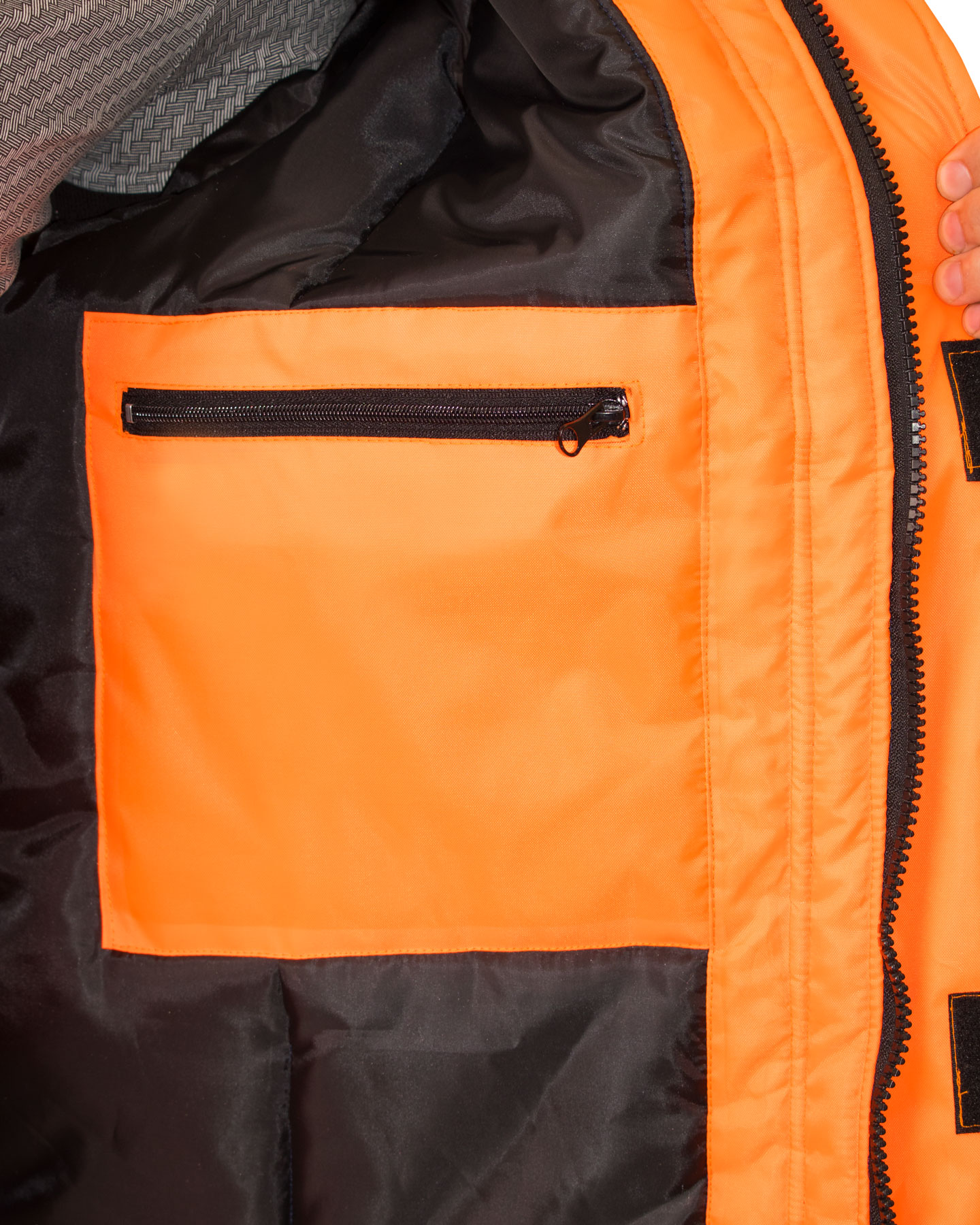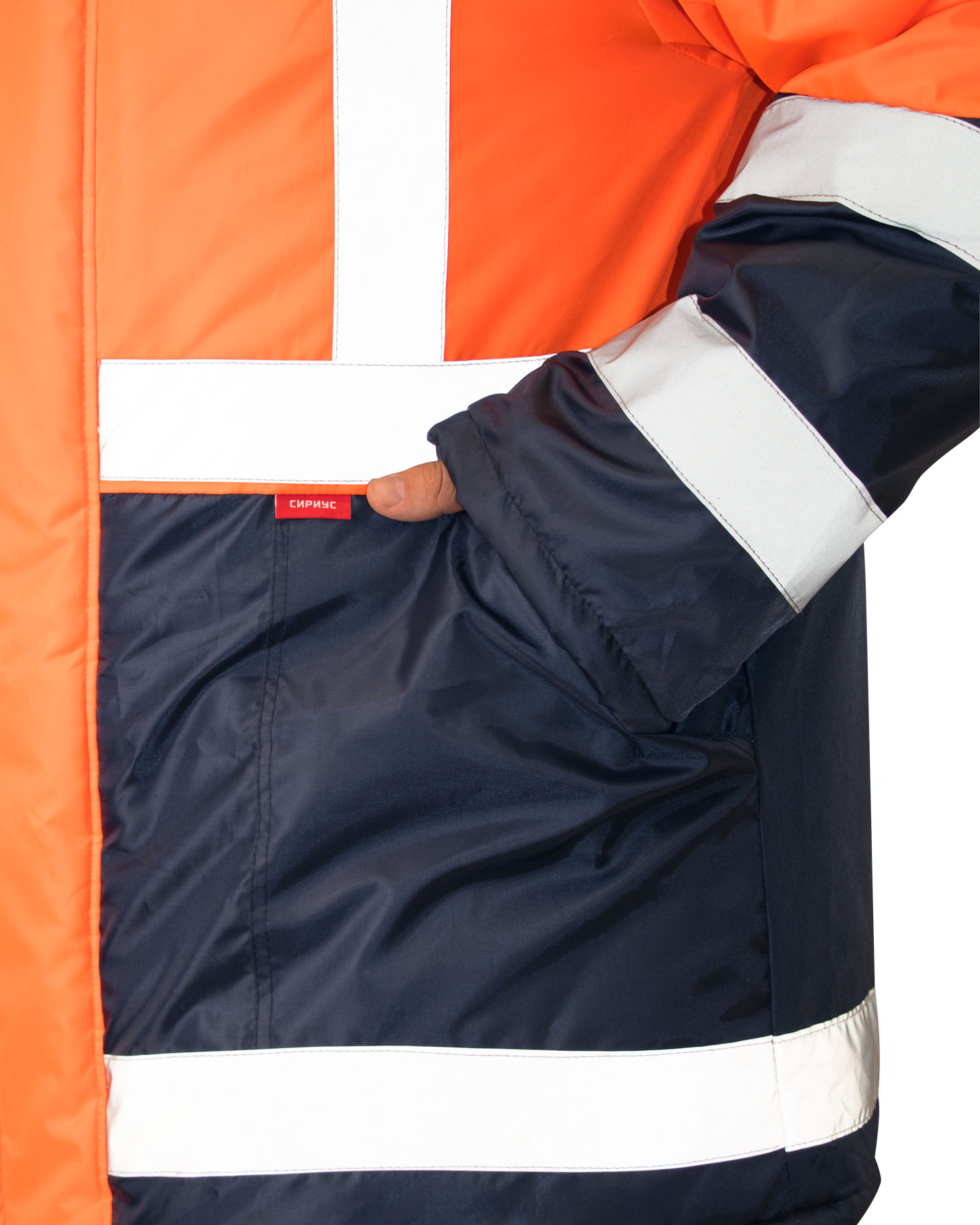 КУРТКА прямого силуэта; с притачной утеплённой стеганой подкладкой, с центральной застёжкой на двухзамковую тесьму «молнию», с ветрозащитной планкой застегивающейся на потайные текстильные «липучки», с втачным утепленным капюшоном. Рукава втачные. По полочкам, спинки в области груди, талии, низа и низа рукавов настрачивается СОП 50мм для обозначения сигнальной видимости.