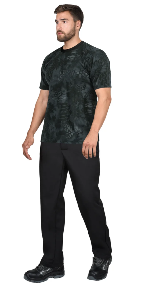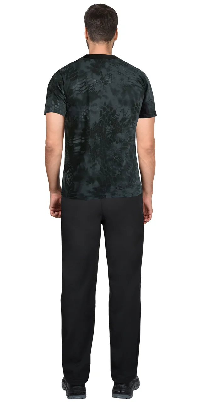 Футболка прямого кроя с короткими рукавами и круглым вырезом горловины, обработанным эластичной рибаной. Расцветка КМФ Питон чёрный обеспечивает отличную маскировку в сумерках и ночью, идеальна для охоты, рыбалки и тактических операций.