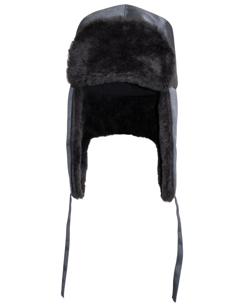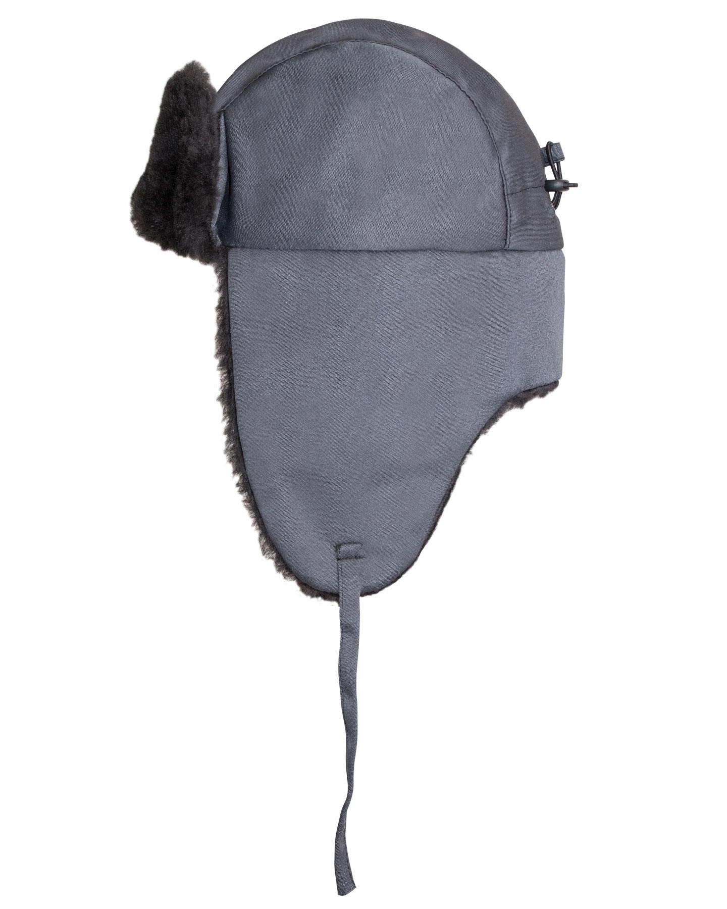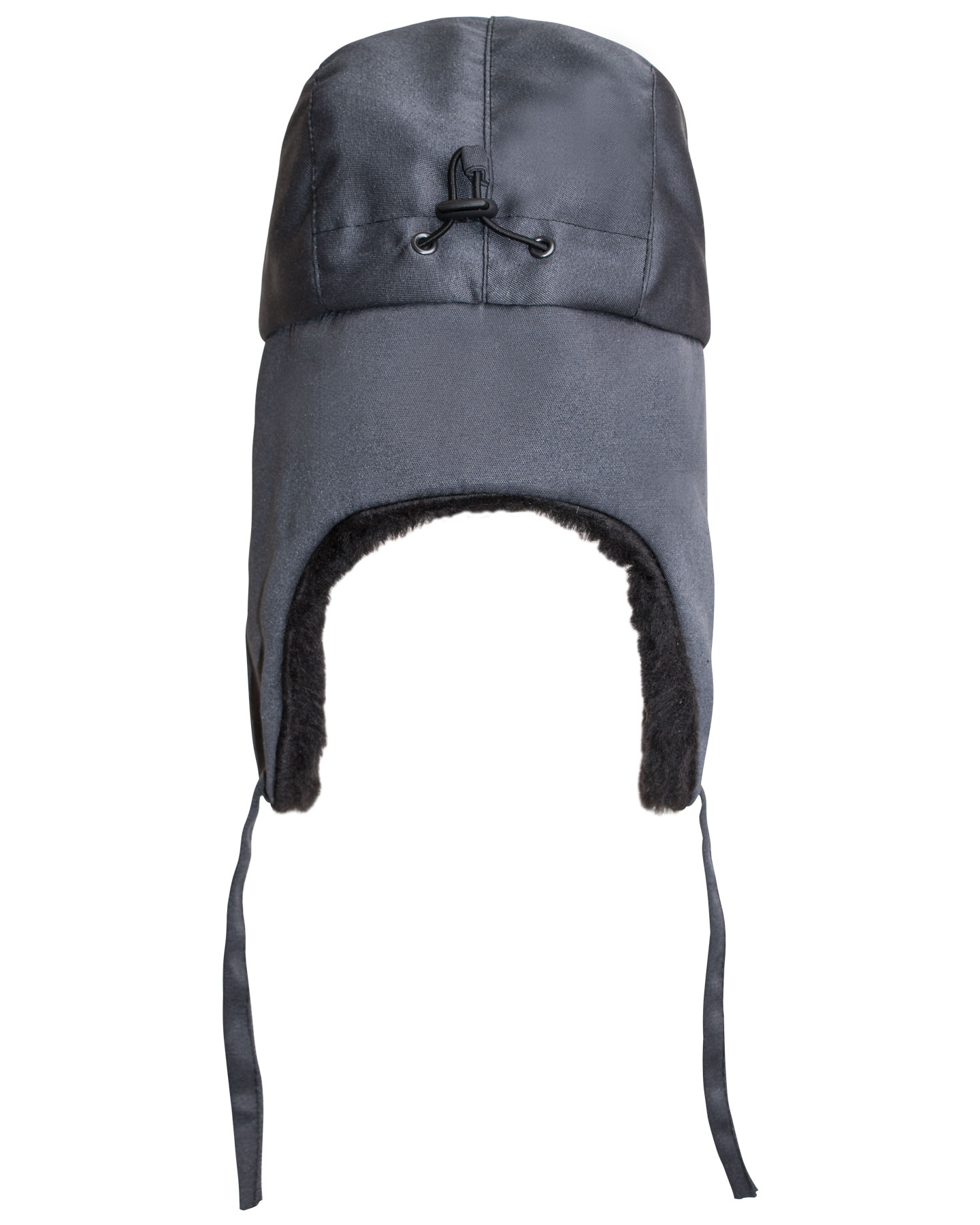 Шапка-ушанка зимняя темно-серая с искусственным мехом черного цвета. В затылочной части объем регулируется за счет резинки и фиксатора.