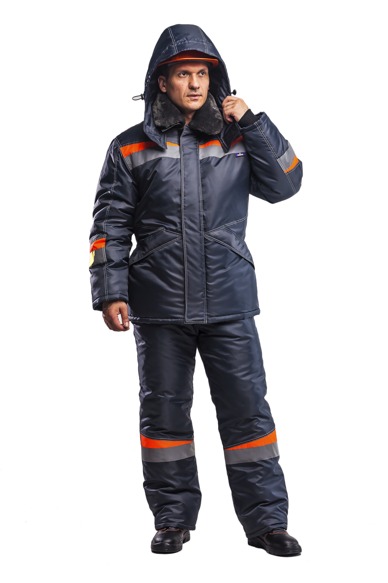 Удлиненная куртка с центральной застежкой на двухзамковую молнию и ветрозащитную планку с контактной лентой. Пристегивающийся капюшон с регулируемым объемом, позволяет одевать капюшон на каску. Пристегивающийся меховой воротник на пуговицах. Нижние накладные утепленные карманы застегиваются на контактную ленту. Внутренний карман на молнии с именной этикеткой. Рукава с трикотажными напульсниками. Объем по линии талии спинки регулируется при помощи эластичного шнура и кулиски.