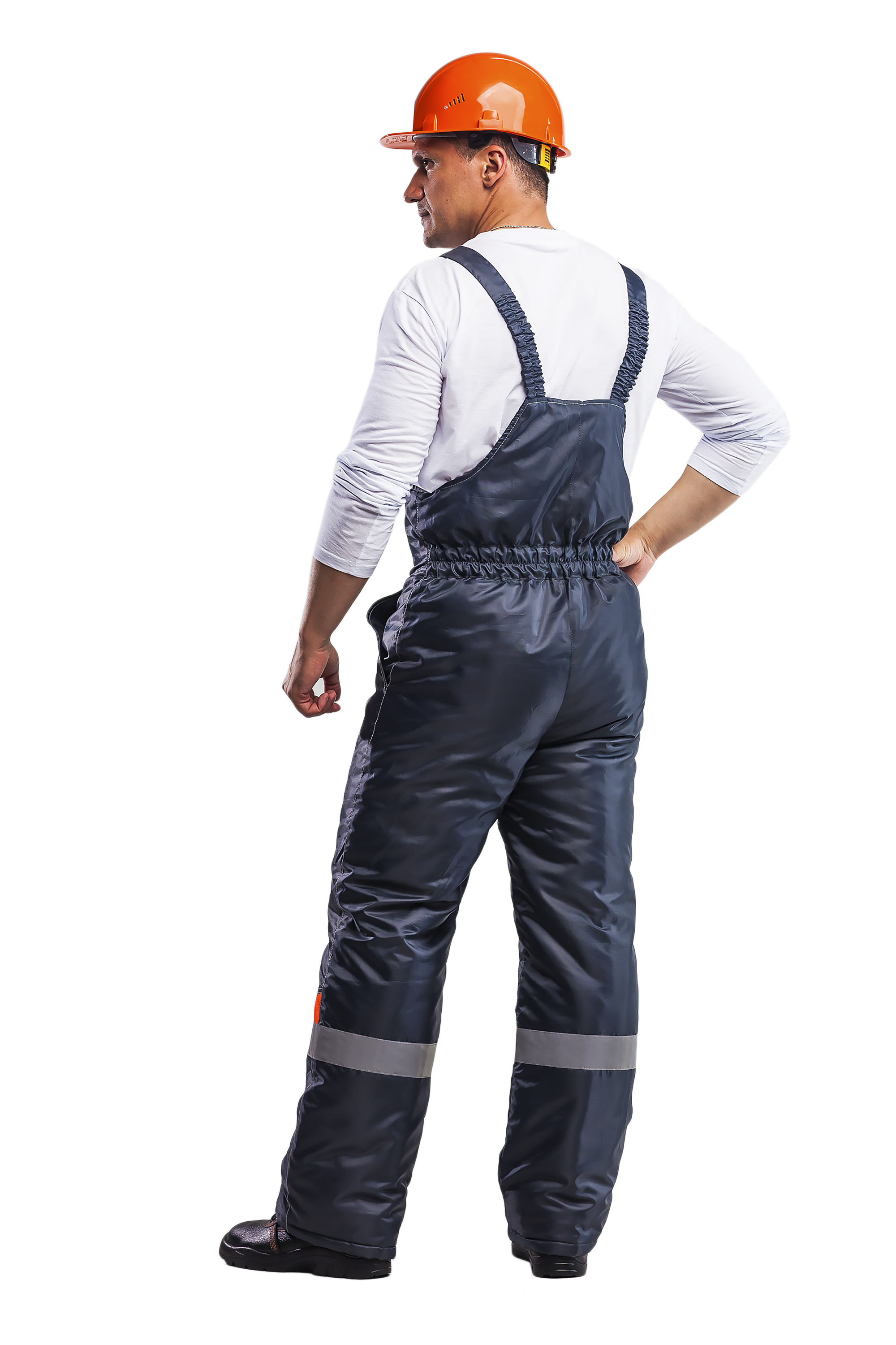 Полукомбинезон с высокой грудкой, центральной застежкой на двухзамковую молнию. Бретели с эластичной тесьмой и застежкой на фастексы, пояс по спинке с эластичной тесьмой. Два боковых кармана и один карман с клапаном на груди для телефона. Элементы из контрастной отделочной ткани и СОП 50 мм на спине, полочках, рукавах куртки и по низу полукомбинезона. Все отделочные строчки выполнены светло-серыми нитками.
