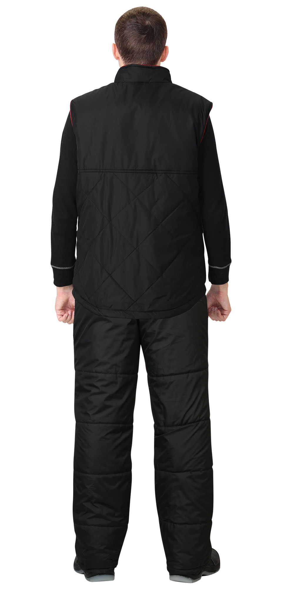 Жилет утеплённый, стёганный, прямого силуэта, на подкладке из флиса с центральной бортовой застёжкой на молнию, с воротником стойка, с нагрудным карманом с молнией и нижними фигурными утеплёнными карманами. Жилет с удлинённой спинкой. ГОСТ 25295-2003