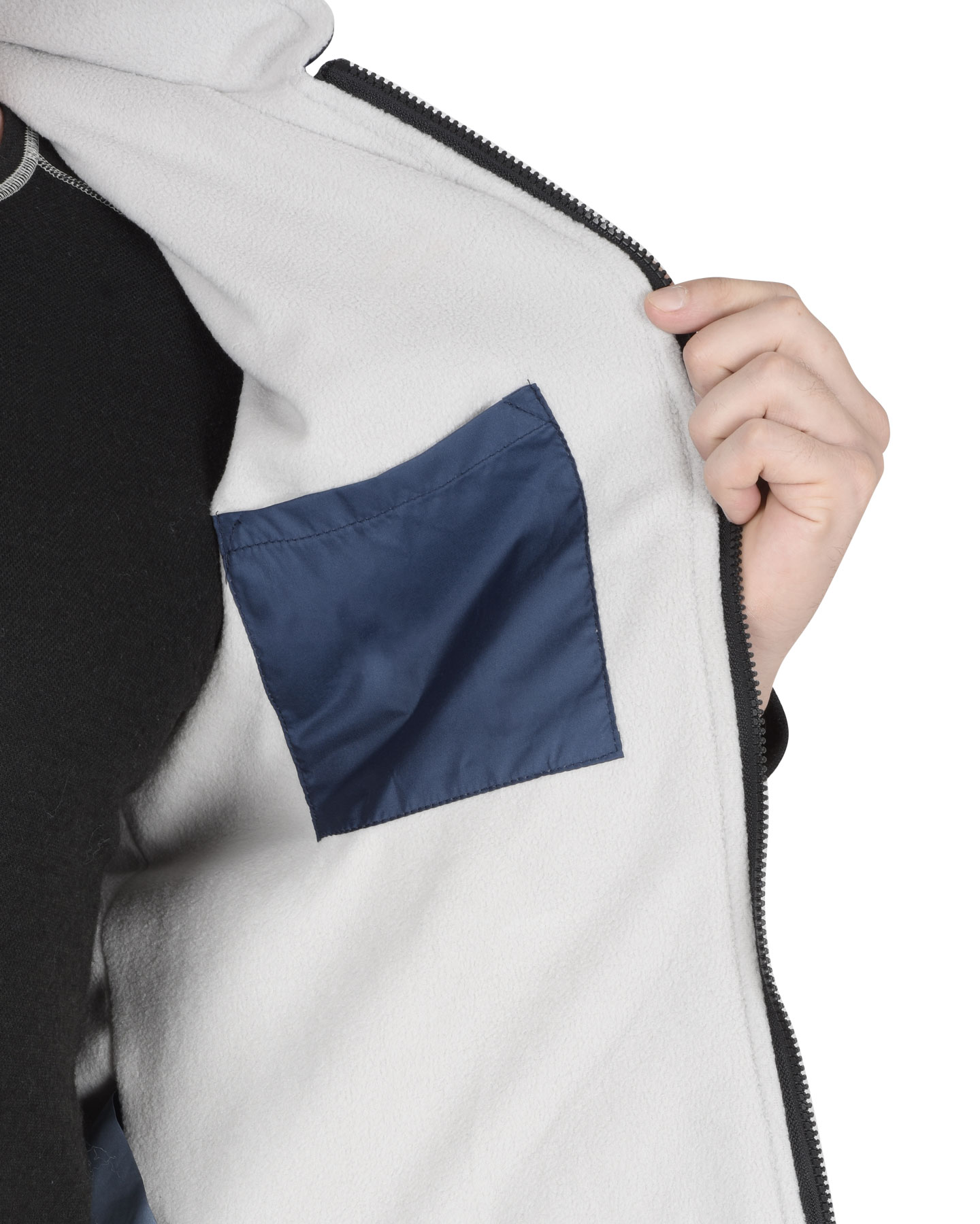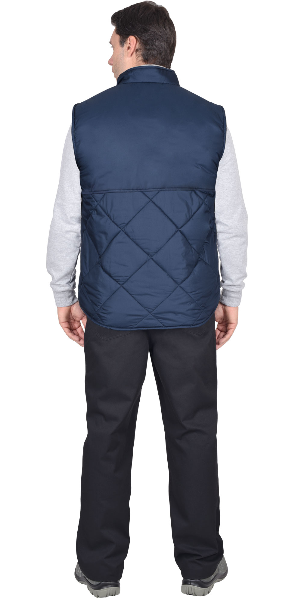 Жилет утеплённый, стёганный, прямого силуэта, на подкладке из флиса с центральной бортовой застёжкой на молнию, с воротником стойка, с нагрудным карманом с молнией и нижними фигурными утеплёнными карманами. Жилет с удлинённой спинкой. ГОСТ 25295-2003