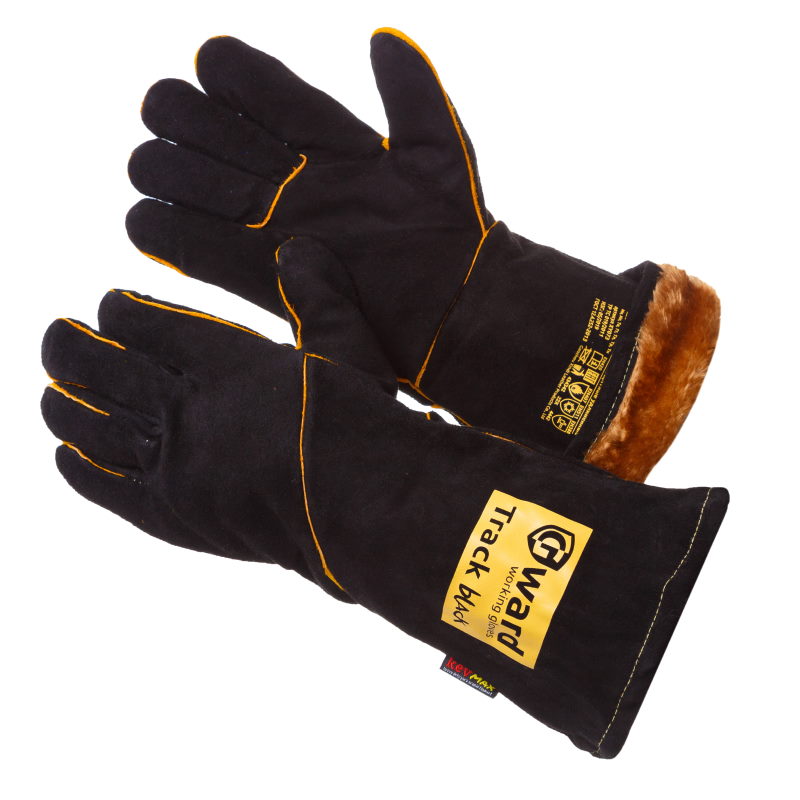 Цельноспилковые зимние сварочные краги с расширенным раструбом. Сшиты из чёрного спилка премиум-качества, утеплены плотным и толстым искусственным мехом типа "мутон", прошиты параарамидными нитями Kevmax.
